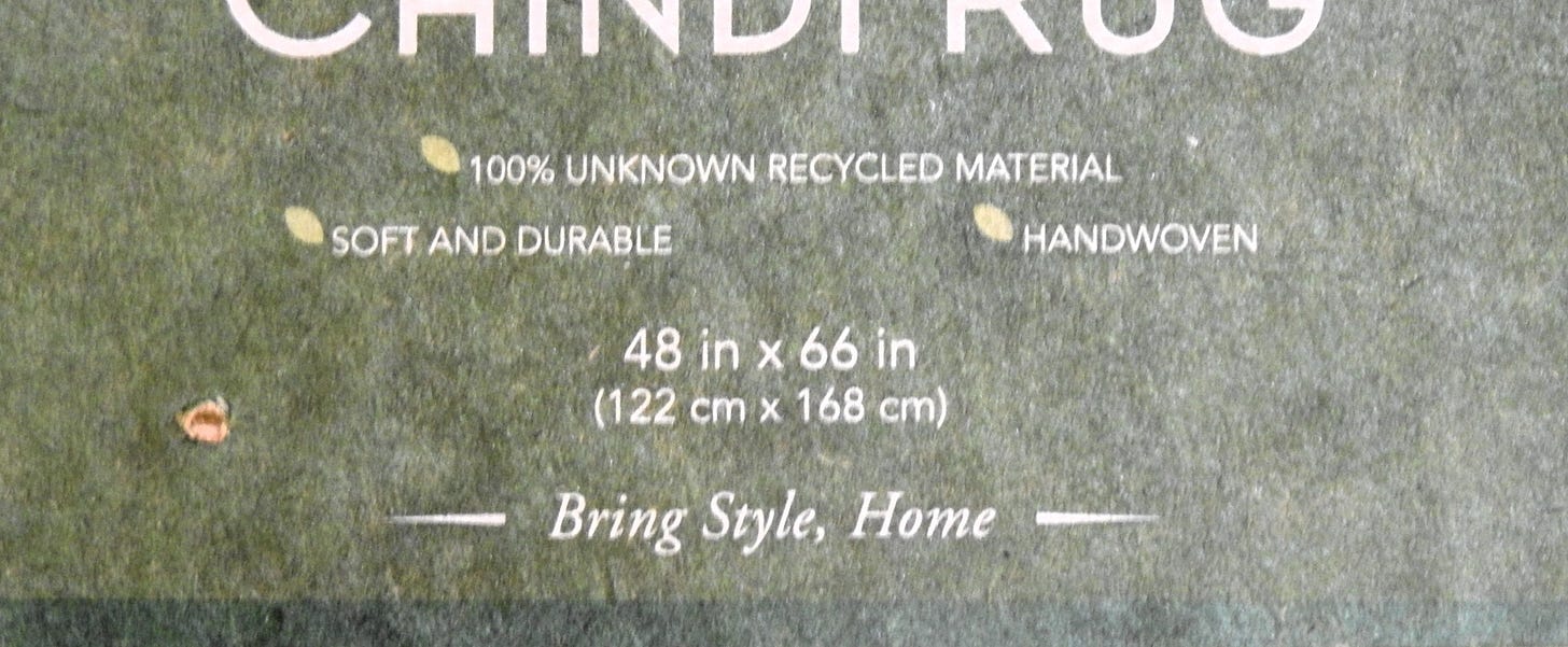 The trigger for this exchange of words came in part from the label from a rug I bought the other day for $9.99. A handwoven rag rug made in India that reminded me of my mother who cut up t-shirts, pantyhose and garments for re-usage to weave back into similar rugs. The label on this one reads: